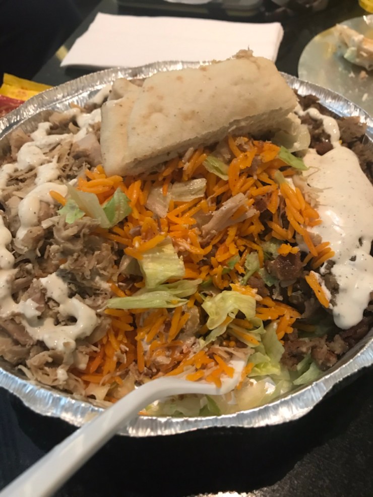 Para entonces, teníamos hambre, así que caminamos unas pocas cuadras hasta el carro de la calle de Halal Guy’s. Nos encantan los chicos Halal y tratamos de visitar cada vez que vamos a la ciudad de Nueva York. Pedimos un plato de pollo y carne de res, servido con arroz, ensalada, pita y su increíble salsa blanca. Hacía calor afuera, así que cruzamos la calle y almorzamos en el vestíbulo del Hotel Hilton al otro lado de la calle (hay baños limpios en este lugar).